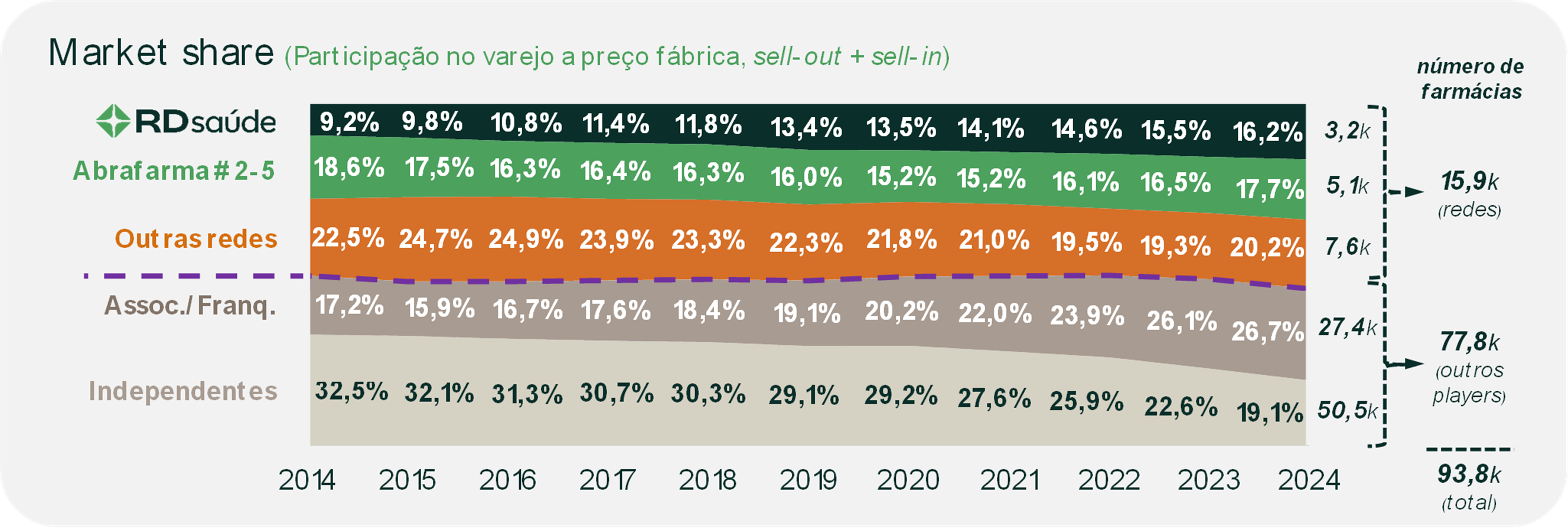 Mercado fragmentado , com o líder (RD Saúde) contando com 16% de market share e menos de 5% da quantidade de farmácias no país.