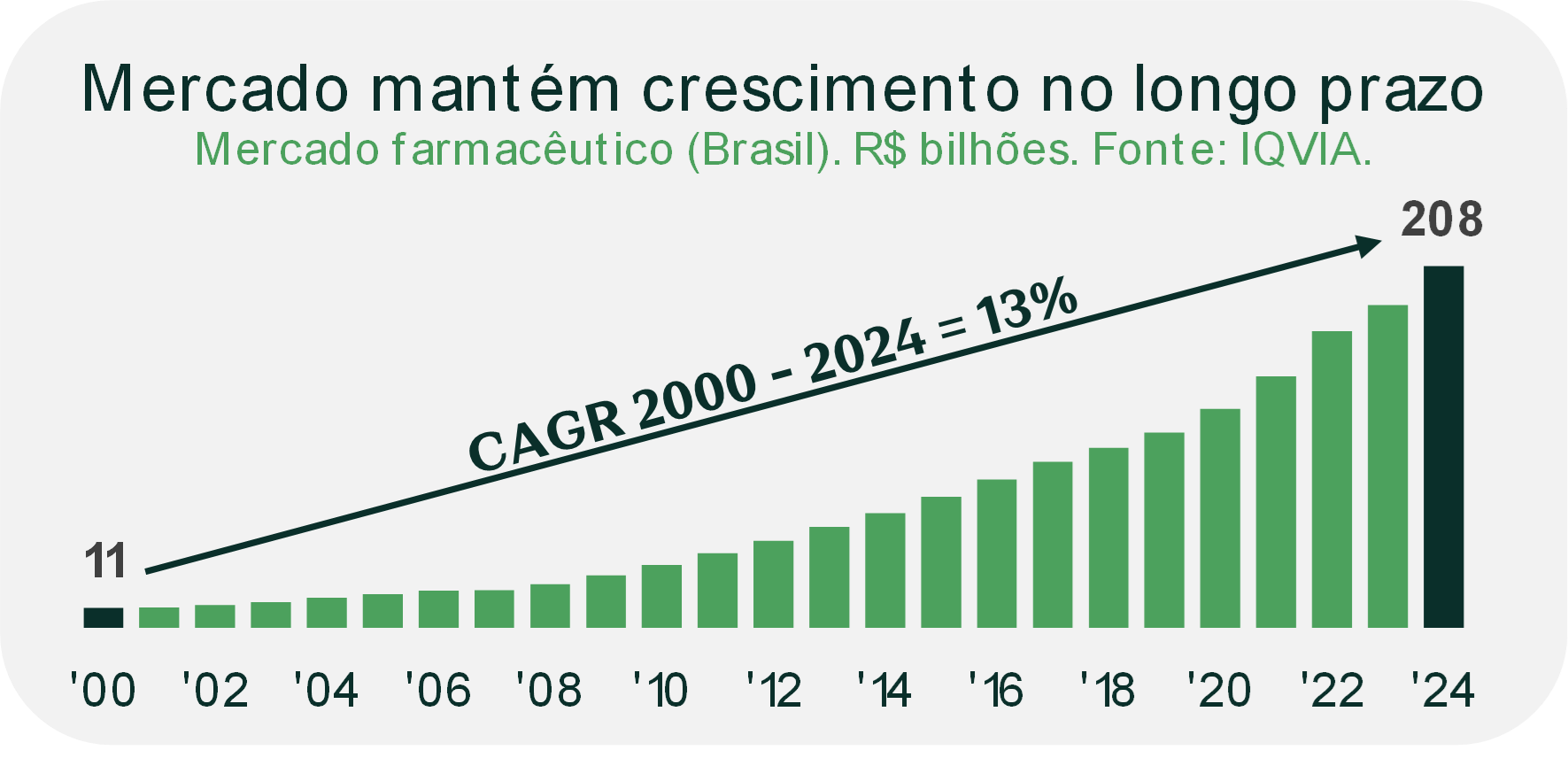 A companhia vem mantendo um ritmo sólido de inauguração de farmácias, ao mesmo tempo em que fortalece seus canais digitais. Essa estratégia, sustentada por disciplina operacional e uso eficiente de capital, tem garantido expansão do EBITDA, margens superiores e resiliência mesmo em cenários macroeconômicos desafiadores. O resultado é uma trajetória consistente de crescimento em lojas, receita e rentabilidade desde a fusão de Raia e Drogasil em 2011: